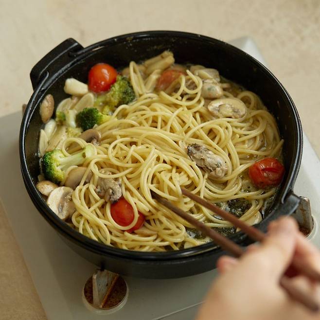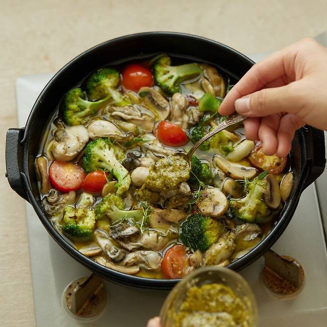 5. 굴이 익으면 불을 끄고, 바질 페스토를 넣어 섞어주세요. 소금과 후춧가루를 넣어 간을 맞추고 타임을 올려 주세요.자료=우리의 식탁 제공