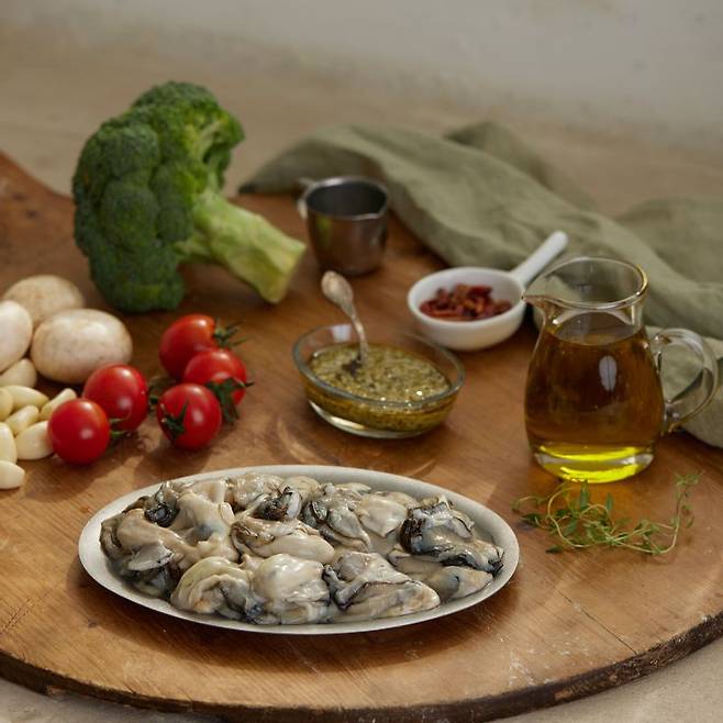 주재료 : 굴 300g, 통마늘 20쪽, 브로콜리 ¼ 송이, 양송이버섯 4개, 방울토마토 5개, 페페론치노 6개, 바질 페스토 2큰술, 올리브오일 1컵, 소금 ½ 작은술, 후춧가루 약간, 타임 약간