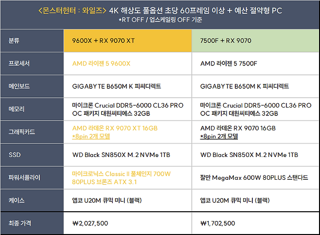 사람들이 갑자기 라데온을 찾는 이유가 뭘까요? 새로 나온 AMD 라데온 RX 9070과 RX 9070 XT 때문입니다. 이들은 지포스로 따지면 RTX 5070 ~ 5070 Ti (RTX 4070 Ti ~ 4080 SUPER)에 준하는 성능인데 가격은 더 저렴합니다. 그리고 <몬스터헌터 : 와일즈>에서는 동급 지포스 그래픽카드보다 성능이 훨씬 잘 나오죠. 그래서 이번 본체의 그래픽카드는 AMD 라데온 RX 9070 XT로 선정했습니다.