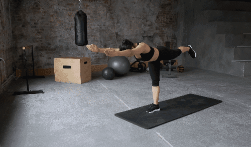 매트 위에 두 발을 모으고 똑바로 서서 시작합니다. 오른발로 체중을 실은 채, 왼발을 천천히 뒤로 뻗습니다. 동시에 상체를 앞으로 숙이고, 두 팔은 앞으로 쭉 뻗어줍니다. 중심을 잡으며 버티세요. 반대편 다리로 반복합니다.