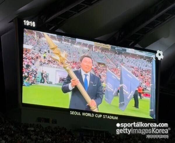 차범근 전 감독은 아이콘 매치의 상징과도 같은 창, 방패 모양의 엠블럼을 들고 경기장에 나타났다.
