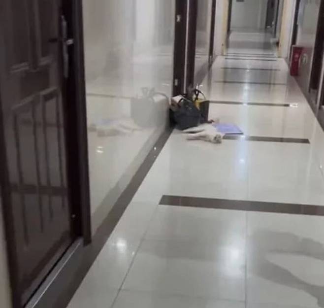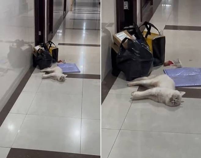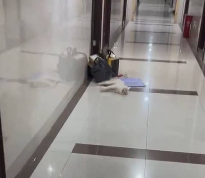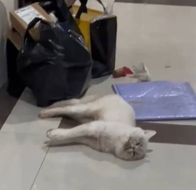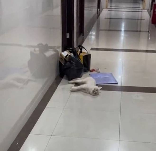 하얀 고양이는 차갑게 식은 채 복도 바닥에 누워 있었고 몸은 이미 뻣뻣하게 굳어 있었습니다. 옆에는 비닐봉지와 종이박스 같은 잡동사니가 쌓여 있었죠.