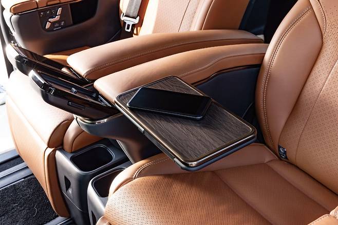 2열의 좌우 암레스트 안쪽에는 작은 접이식 테이블이 들어있다. 차에서 음식을 먹거나 태블릿 등을 활용할 때 편하다. 암레스트에 부착된 스마트폰 형태의 좌우 독립형 컨트롤러는 2열의 공조 장치, 조명, 선셰이드, 오디오 등 모든 기능을 손쉽게 제어하도록 돕는다.