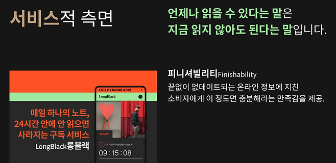 대부분의 사람들은 온라인상에 너무 많은 콘텐츠들을 접하면서 아무리 공부하고 또 공부해도 끊임없이 읽을 게 남아 있다는 막막한 기분에 휩싸이는 경우가 많다. 롱블랙은 그런 점을 간파해 ‘오늘은 이거 하나만 읽으면 해야 할 일을 완수했다’는 피니셔빌리티를 준다. 이와 관련 임 대표는 “많은 분들이 강제성을 부여해 준 덕분에 내가 더 많은 지식을 소비하게 됐다고 한다”며 롱블랙을 이용하는 소비자들의 심리적 만족감에 대해 말을 이어갔다.