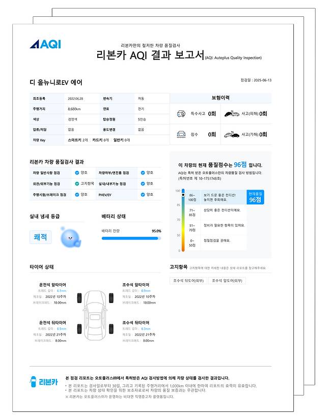 리본카는 소비자가 중고차의 품질을 더욱 투명하게 확인할 수 있도록, 자체 특허 기술을 적용한 약 60페이지 분량의 'AQI 리포트'를 제공하고 있다. 'AQI 리포트'에서는 ▲차량 시트 오염도 ▲타이어 마모 상태 ▲보험 이력 ▲엔진룸 청결도 ▲각종 누유∙누수 여부 등 일반 소비자가 놓치기 쉬운 항목을 직관적으로 보여준다. 특히 일반 소비자들이 체감하기 어려운 '실내 냄새'를 등급화해 시각적으로 표현한 점이 특징이다. 또한, PHEV∙EV 차량의 경우 충전구 절연 상태, 가상 엔진 사운드 작동 여부 등 특화 항목까지 포함돼 있어, 비대면 거래에서도 차량 상태를 명확히 확인할 수 있다.