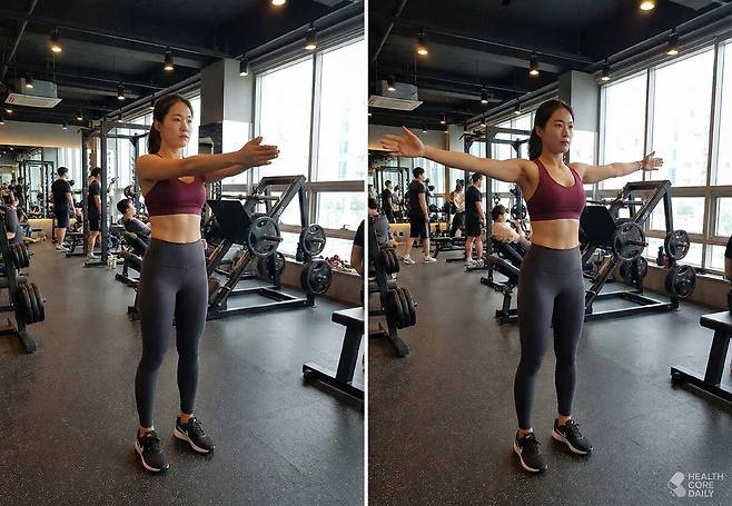 몸을 곧게 세운 상태에서 두 팔을 앞으로 뻗고 손바닥을 서로 마주 보게 둔다. 팔꿈치는 완전히 잠그지 않고 자연스럽게 편다. 이후 두 팔을 좌우로 천천히 벌리며 가슴을 연다. 다시 팔을 모아 처음 자세로 돌아오며 이 동작을 반복한다.