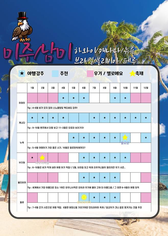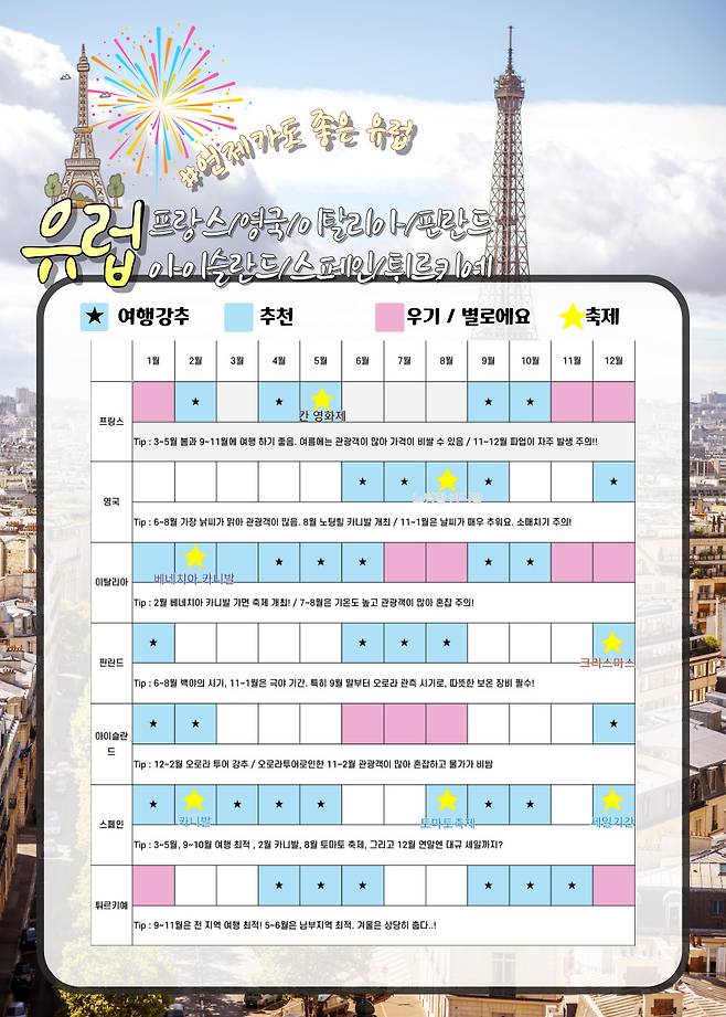지금까지 떠나기 좋은 월별 해외 여행지의 특징을 살펴보았습니다. 각 나라와 도시마다 독특한 매력과 최적의 방문 시기가 있다는 것을 알 수 있었는데요.