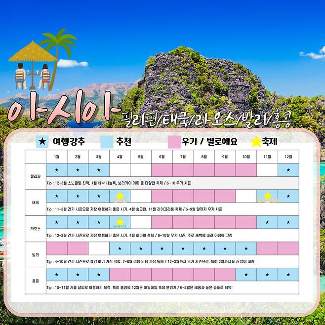 필리핀은 11월부터 3월까지 건기 시즌으로 다양한 야외 활동을 즐기기 좋은데요. 특히 스노클링에 최적화된 시기로, 여행 경비가 살짝 비쌀 수 있습니다. 6~10월은 잦은 비와 태풍으로 조심해서 여행을 계획하셔야 합니다.