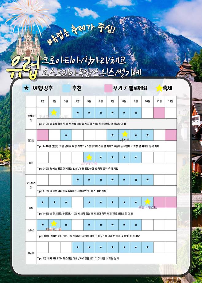 오스트리아는 비엔나와 잘츠부르크 등의 고풍스러운 도시와 알프스산맥의 자연이 어우러져 있는데요. 5월부터 9월까지의 여름철은 야외 활동과 축제를 즐기기 좋습니다. 오스트리아는 모차르트의 고향답게 5월과 6월 사이에는 다양한 음악 페스티벌 행사로 시끌벅적하니, 클래식을 좋아하시는 분들은 이 시기 여행을 계획하는 것을 추천해 드립니다.