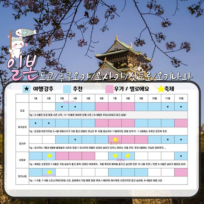 언제 가도 좋은 도쿄와 후쿠오카는 3~4월 벚꽃 시즌으로 유명한데요. 우리나라와 비슷하게 3월 말부터 4월 초까지 벚꽃이 만개해 도쿄의 공원이나 거리를 걸으며 환상적인 풍경을 감상할 수 있어요. 날씨도 온화해서 여행하기에 아주 적합하답니다.