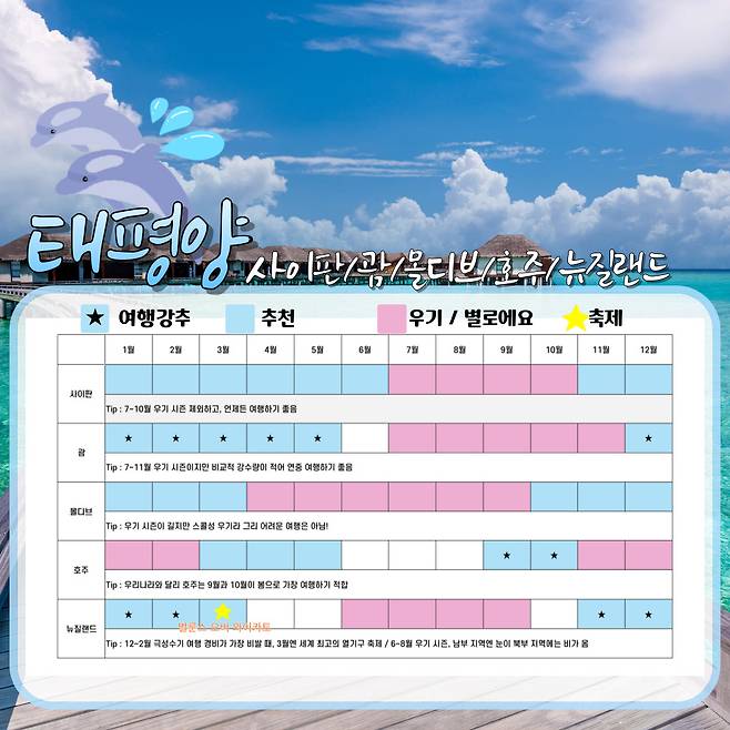 사이판은 열대성 기후로 연중 온화한 날씨를 자랑하는데요. 하지만 7월~10월은 우기로 피하는 것이 좋습니다. 이 외에는 스노클링, 수영, 등 해양 스포츠를 즐기기에 최적이며, 1월부터가 3월까지 여행 최적기입니다.