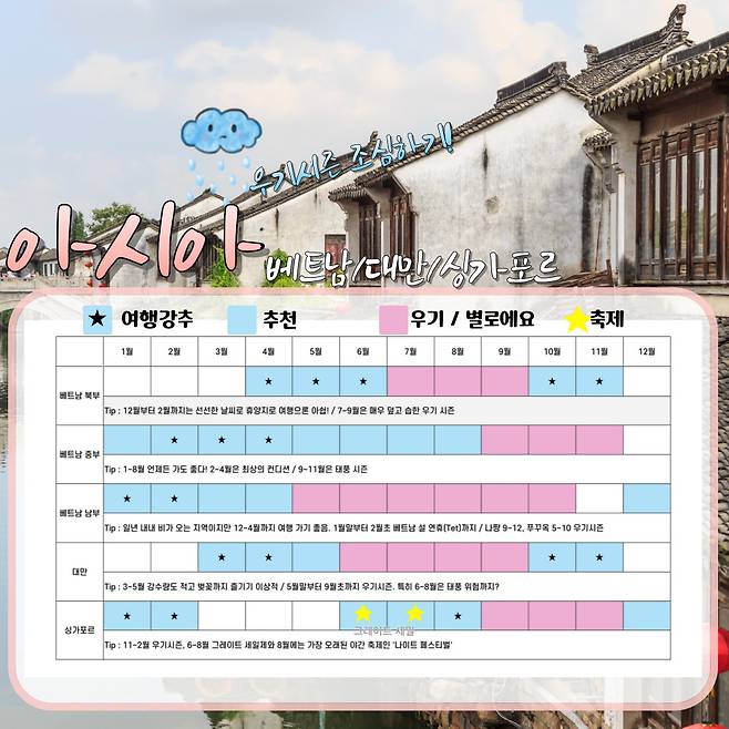 대만은 보통 10~4월까지 여행 적기인데요. 적은 강수량과 함께 기온이 온화해 이 기간에는 언제든 방문해도 좋습니다. 다만, 6월부터 9월은 상당히 강수량이 많은 우기로 여행 전, 많이 고민해 봐야 합니다.