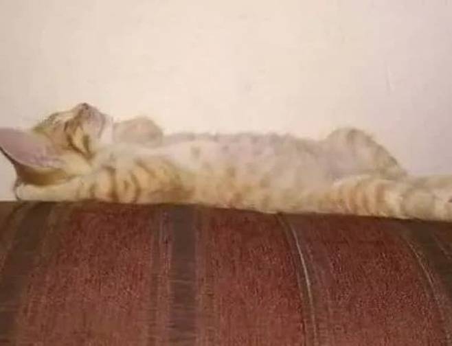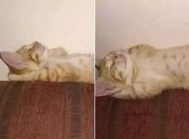 혹시 고양이 탈을 쓴 사람이 아닐까 의심이 될 정도인데요. 보면 볼수록 믿겨지지 않는 고양이의 수면 자세가 화제를 불러 모으고 있습니다.