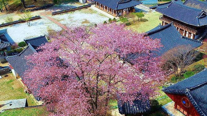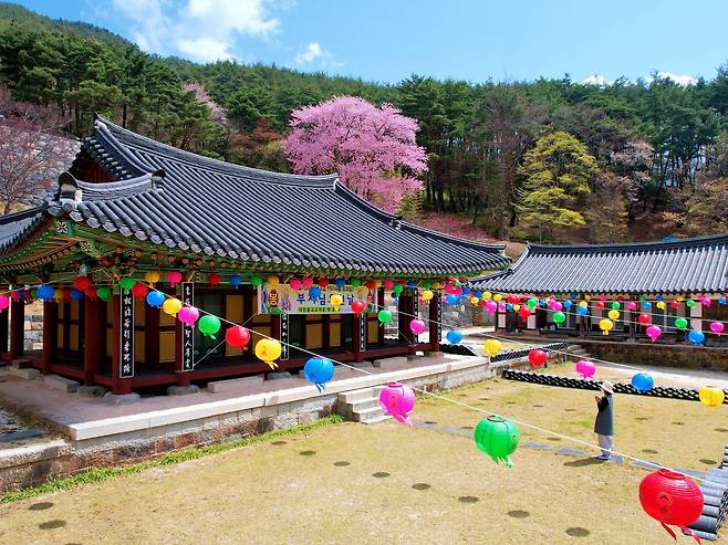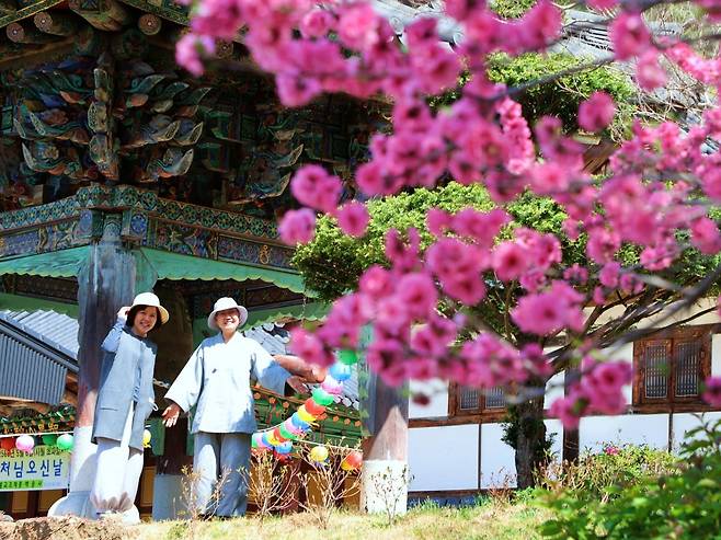 “몽글몽글한 연분홍 꽃잎과 산사 풍경의 조화”