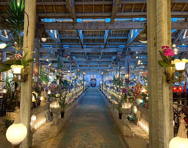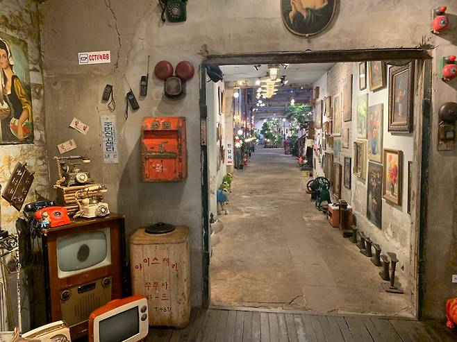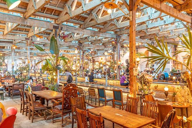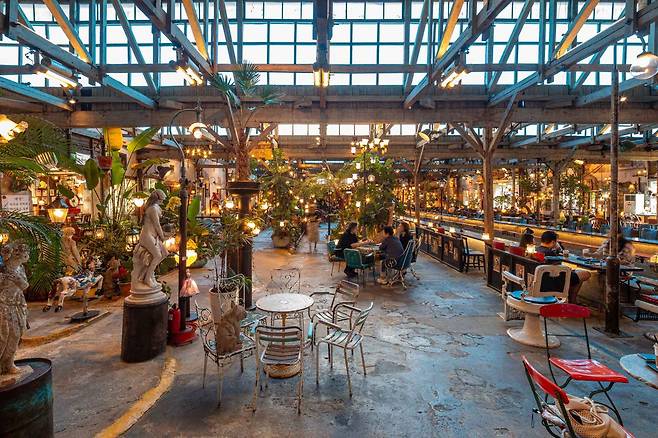 외관은 낡고 거친 철문, 벽돌의 질감 그대로지만, 안으로 들어서면 완전히 다른 세계가 펼쳐집니다. 거대한 작업대는 커피 테이블로, 오래된 벽면은 미술관 벽처럼 꾸며졌고, 공장의 구조는 그대로 살리면서 곳곳에 유럽과 아시아에서 가져온 빈티지 소품들로 채워져 있어요. 체코 기차에서 떼어온 둥근 거울, 영국의 낡은 문짝, 붕어빵 기계마저도 인테리어의 일부가 되어 마치 시간 여행을 떠난 듯한 느낌을 줍니다.