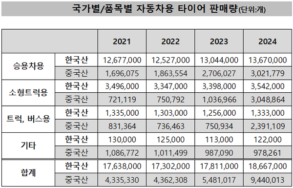 대한타이어산업협회에 따르면 지난해 관세청을 통관한 수입산 타이어는 1858만3757개다. 중국산 타이어는 944만개로 50.8% 비중을 차지했다. 전년동기(548만개)와 비교하면 72.2% 급증했다. 품목별로는 소형트럭·밴 전용 제품이 304만8864개(전년비 194%↑)로 가장 많았고 △승용 302만개(11.7%) △트럭·버스용 239만개(218.4%) 등도 큰 폭의 증가율을 기록했다.