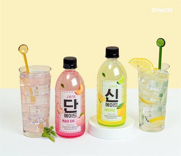 이마트24는 차별화 상품 ‘단 에이드’와 ‘신 에이드’의 2종을 출시했다. 소비자들이 쉽게 맛을 추측할 수 있는 네이밍의 제품이다. 단 에이드는 복숭아와 자두의 달콤한 향과 맛을 풍부하게 느낄 수 있는 음료며, 신 에이드는 레몬과 라임의 조화로운 맛으로 신맛을 강조해 마시는 순간 새콤함을 느낄 수 있다. 최근 음료 시장의 트렌드에 맞춰 칼로리와 당을 낮춘 제로 음료로 출시했다. 가격은 1,300원이다.