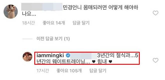 마른 몸일 때도 글래머러스한 몸일 때도 늘 여성들의 워너비인 강민경은 다이어트에 대한 확실한 답변을 내놓았습니다. 자신의 SNS에 몸매 관리 비법을 묻는 팬을 향해 "3년간의 절식과 5년간의 웨이트 트레이닝"이 비법이라고 밝힌 것인데요.