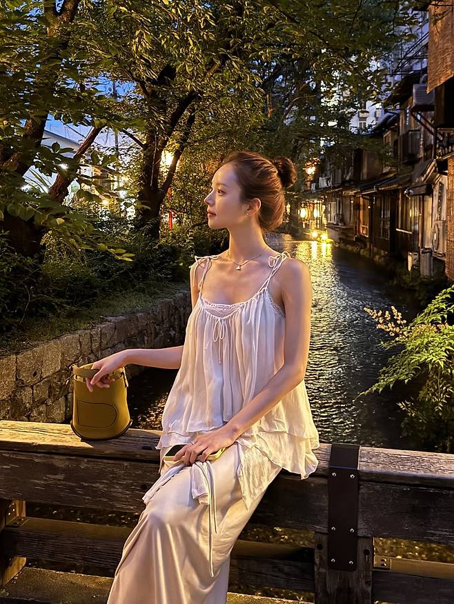 사진 속 김지영은 은은한 조명이 감도는 일본의 거리와 강변에서 우아한 분위기를 뽐냈다.