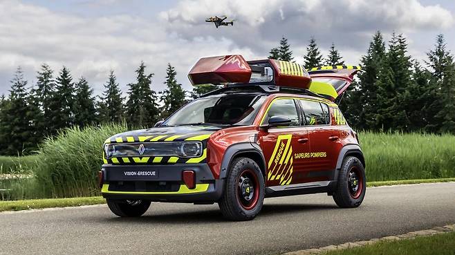 르노가 최근 선보인 전기차 '르노 4'를 기반으로 한 소방용 긴급구조 콘셉트카 '비전 4 레스큐'를 공개했다. 이 차량은 비상 상황에서 활용할 수 있도록 특별히 설계된 시연 차량이다.