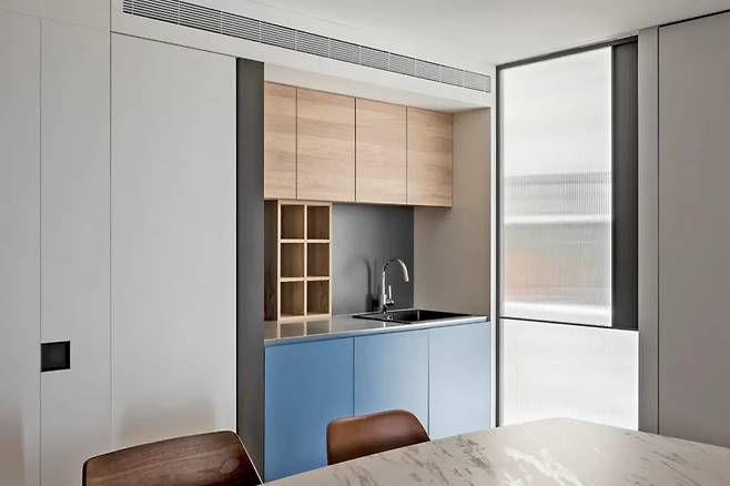주방 중앙에는 딥 블루 컬러의 섬 형태 키친 아일랜드가 설치되어 요리, 커피 한 잔, 고양이들의 식사 준비까지 다양한 활동이 가능하다. 특히, 고양이들의 팔꿈치 공격으로부터 안전을 확보한 마그컵 전용 수납 칸이 마련되어 있다.