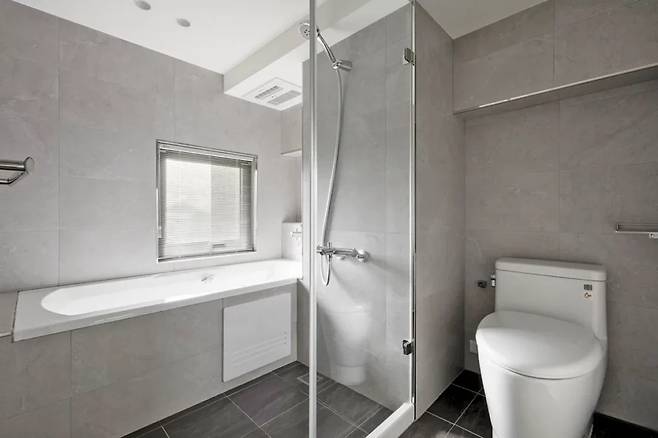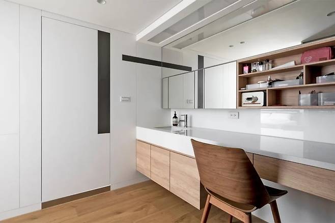 가장 넓고 여유로운 구조는 욕조를 위해 선택되었다. 공간 활용을 위해 세면대는 욕실 밖으로 분리되었으며, 세면대 상단은 거울장과 화장용 콘솔 기능이 결합되어 있다. 여성의 뷰티 루틴을 고려한 설계가 돋보이며, 높은 수납력도 만족스럽다.