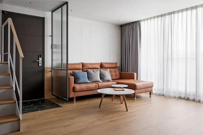 작아 보이지만 전략적으로 설계된 공간이다. 현관 바닥에는 눈길을 끄는 검정 육각형 타일이 깔려 있으며, 얇고 가벼운 철제 파티션은 공간을 구분하되 시야를 가리지 않는다.