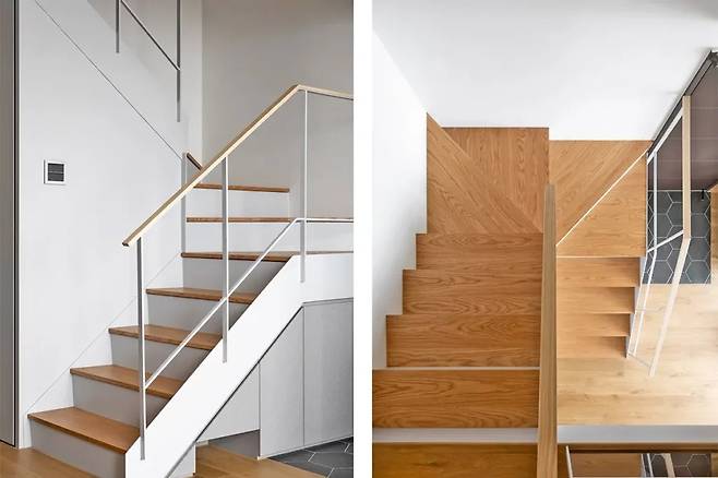 철제 난간과 어두운 톤의 원목 디딤판은 시각적 연속성을 제공하며, 향후 아이를 위한 강화 유리 설치까지 고려한 확장성을 갖추고 있다.