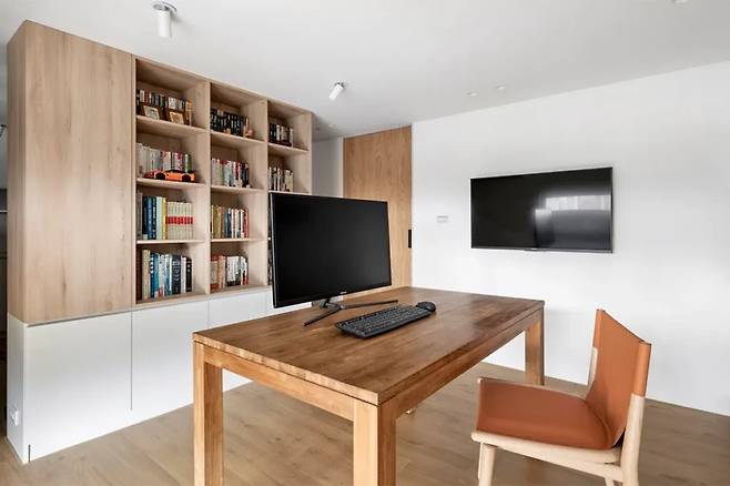 서재와 휴식 기능을 동시에 갖춘 다목적실이 중앙에 위치한다. 책장이 실내를 자연스럽게 구획하며, 한쪽에는 TV와 장비가 깔끔하게 정리되어 있다.