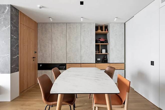 최대한의 수납 효율성을 고려한 연속적인 수납장 라인은 주방 벽면을 따라 이어지며, 전자제품에서 사료, 와인까지 카테고리별로 구분되어 있다.