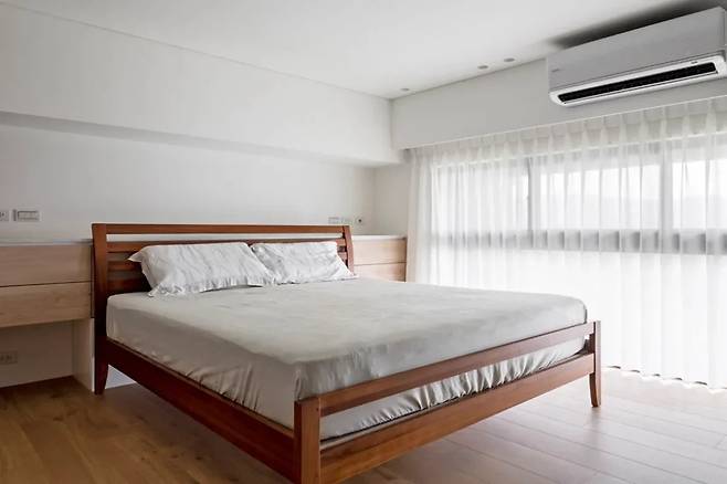 침실은 고양이 세 마리와 함께하는 공간이다. 양측 여백은 고양이들의 침대 공간으로 활용되며, 드레스룸은 벽을 따라 두 면에 L자형 시스템 가구로 최적화되어 있다.