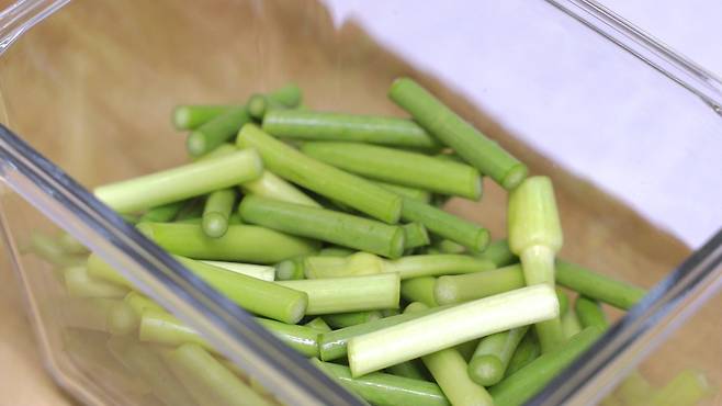 물기를 완전 탈탈 털은 후에 내열용기에 마늘쫑을 잘 담아 놓으세요. 이후 뜨거운 물을 붓기 때문에 반드시 내열용기를 준비해서 넣어 주는 것이 좋아요.