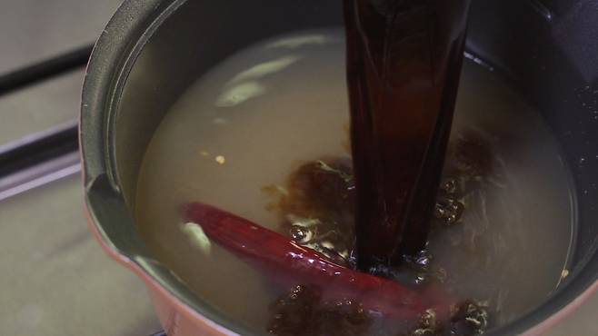건고추, 육수, 간장, 설탕, 식초, 소주를 냄비에 잘 넣으세요.