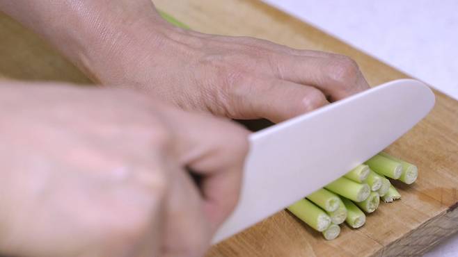먼저 마늘쫑을 손질하세요. 끝 부분을 살짝 자르고 손가락 2마디 정도 크기로 썰어 먹기 좋게 해 주세요.