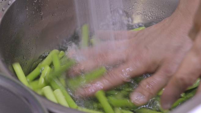 썰어 놓은 마늘쫑은 물에 3번 정도 깨끗이 씻어 놓으세요.