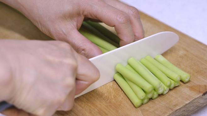 먼저 마늘쫑을 손질하세요. 끝 부분을 살짝 자르고 손가락 2마디 정도 크기로 썰어 먹기 좋게 해 주세요.