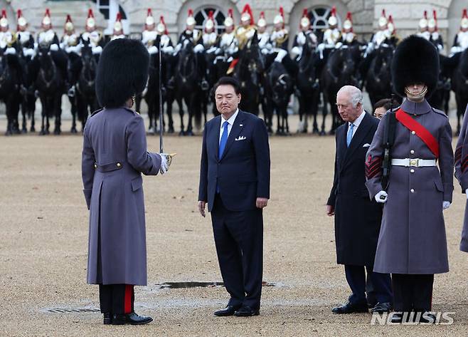 영국을 국빈 방문한 윤석열 대통령은 21일(이하 현지시간) 런던에서 찰스 3세 국왕이 마련한 공식 환영식에 참석했다.