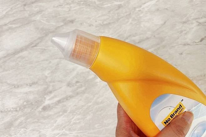 입구 모양이 꼭 새 부리처럼 생겨서 줄눈에 바를 때 용이합니다. 세정제가 묽은 편이라 살짝 기울기만 해도 잘 나옵니다.