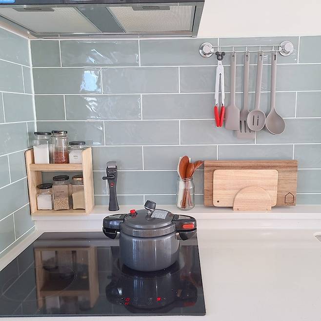주방은 저의 최애 색상인 초록이 물씬 풍기는 타일을 사용했어요:) 주방타일이 식욕을 돋구는 색상은 아니지만 유니크하면서 개성이 있는 공간이다보니 집에 놀러오는 손님들 마다 칭찬해주는 공간이 되었어요 *^^* 인테리어 문의드린 곳에 원하는 색상의 타일이 없다보니 손품 팔아가며 찾았던 타일이라서 더 예쁜 타일이랍니다.