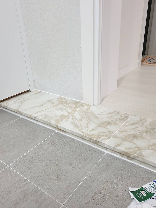 현관도 마찬가지로 깔끔하게 인테리어하고 싶어서 다양한 색상으로 진행하지 않고 2가지로 진행해보았습니다. 현관에 들어오는 대리석 바닥은 저희가 셀프로 어울리는 대리석 시트지를 구입해서 붙이고 실리콘으로 마무리하여 작업했어요.(처음 시도 였는데 괜찮은가요??^^) 실리콘은 다이소가면 자렴한 가격으로 구입할수 있습니다!