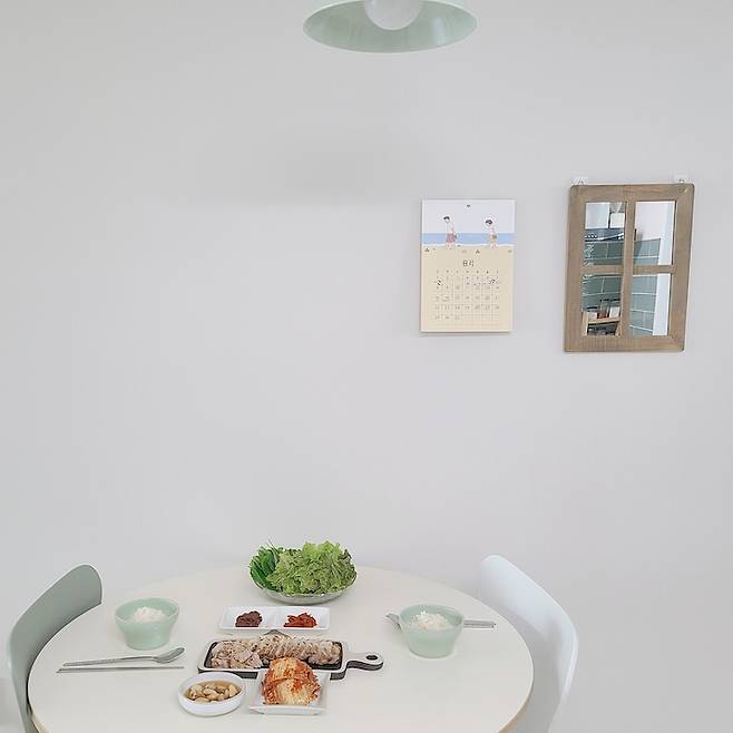 주방 맞은편에 식탁을 배치하고 첫번째 집에서 사용하던 원목가구를 배치하면서 아늑하고 따뜻하게 만들고 싶었어요.  초록색 계열에 주방타일과 화이트톤에 싱크대를 사용하다보니 살짝 차가운 느낌이 날 수 있어 식탁과 그릇 정리수납장, 소품들은 원목을 사용하여 채웠습니다. 그리고 주방 벽에 달력과 창문형 거울을 달땐 꼭꼬핀을 사용하여 벽에 무리가지 않게 사용하였어요.