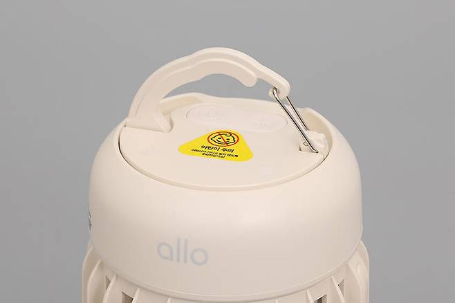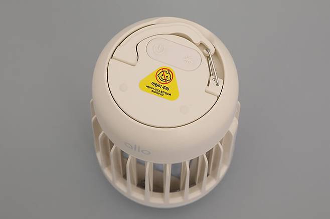 알로코리아 캠핑용 무선 LED 무드등 모기퇴치기 AMT3W의 본체 윗면에는 어린이 주의 스티커가 부착되어 있고, 스티커 바로 위에는 타원형의 버튼이 있다. 버튼의 왼편에는 전원 표시가 있으며, 오른편에는 날벌레 모양이 새겨져 있다.