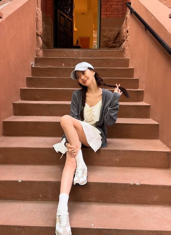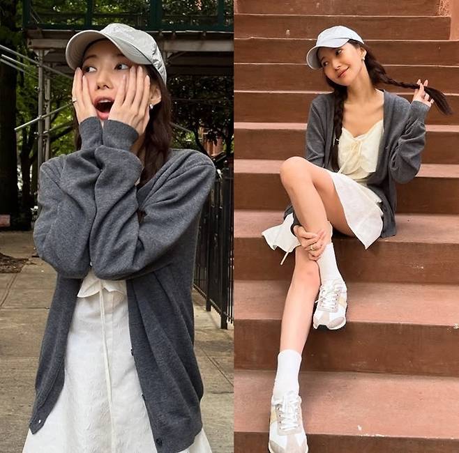배우 박민영이 뉴욕에서 미니 원피스에 카디건을 레이어드한 스타일로 예쁜 러블리한 미모를 과시했다.