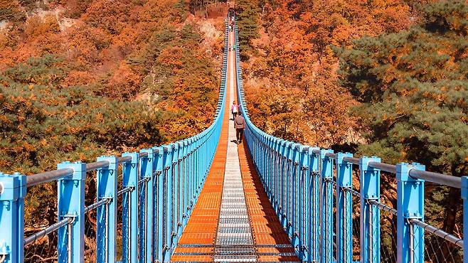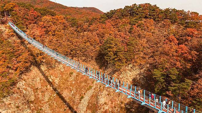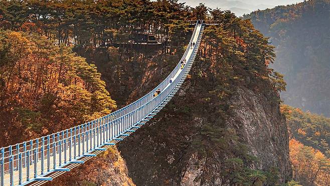 첫 코스는 원주의 아이콘, 소금산 출렁다리. 길이 200m, 높이 100m의 이 다리는 두 봉우리를 잇는 스카이워크다.