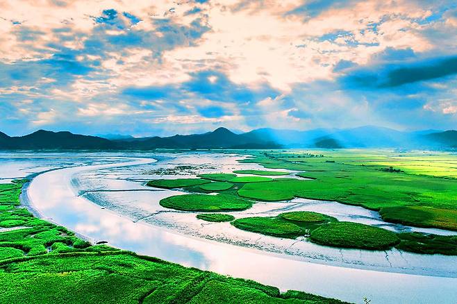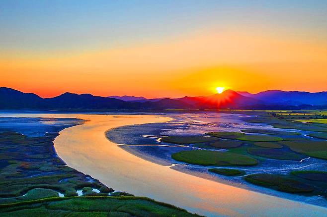 순천의 동천과 이사천이 합류하는 순천만습지는 갯벌 앞부분까지 거대 갈대 군락지가 조성되어 있어 인상적인 풍광을 자랑합니다.
