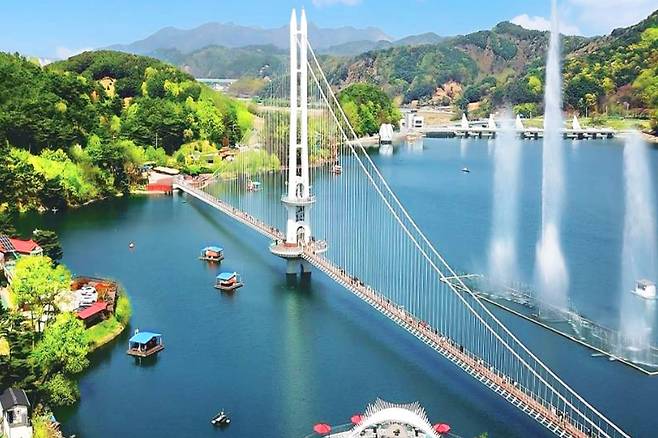 예당호 출렁다리는 402m 길이로 예산의 랜드마크입니다. 호수 위를 가로지르며 걸을 때마다 느껴지는 흔들림은 아찔한 스릴을 선사합니다.