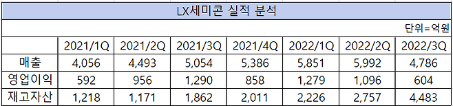 그러나 올해 글로별 경기 침체가 지속되고 러시아-우크라이나 전쟁이 겹치면서 전방산업이 전반적으로 어려워졌다. 또 LX세미콘이 주력으로 하는 디스플레이 산업의 업황도 부진한 상황이다. 이에 따라 LX세미콘도 계절적 성수기임에도 3분기 부진한 실적을 기록했다.