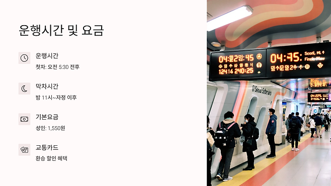 막차 시간 확인 필수: 늦은 시간에 지하철을 이용할 경우, 반드시 막차 시간을 확인하여 이동에 불편함이 없도록 주의해야 합니다.