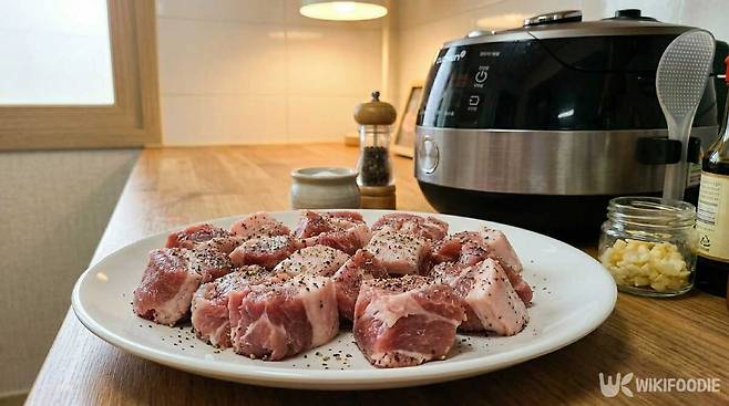 ① 돼지 앞다리살을 큼직하게 썰어 후추로 밑간한다.