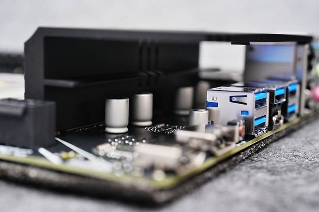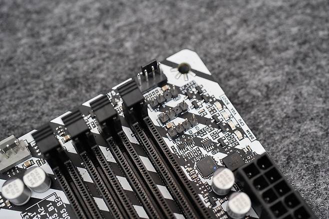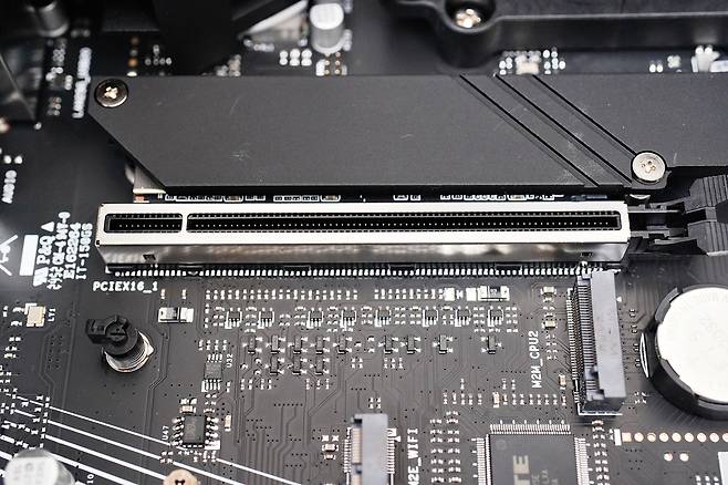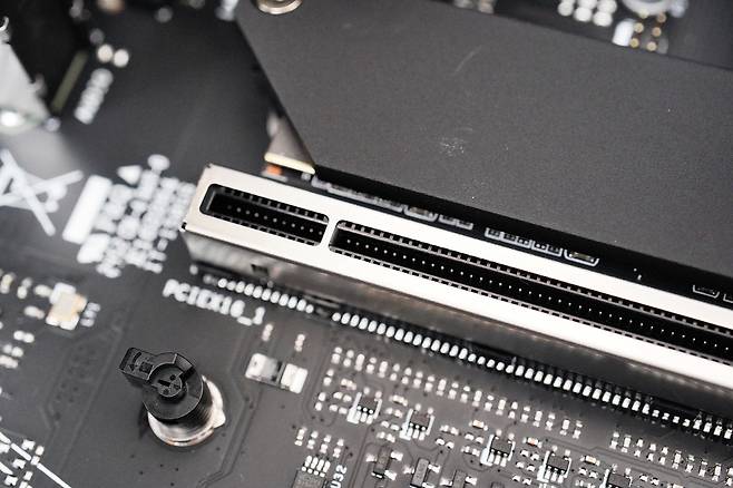 PCB는 메탈 가드 없이도 견고하게 제작되어 무거운 그래픽카드 장착 시에도 슬롯 휘어짐 없이 안정적인 사용이 가능합니다. 슬롯의 내구성과 메인보드의 구조적 안정성 모두 고려된 설계입니다.